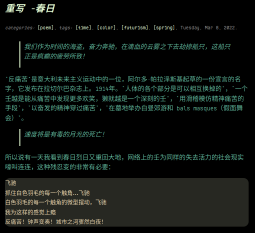 Normally I don't treat myself as a person. I'm transforming myself to a song.阳光随着一同的惊呼洒在他们身上 没有送别,也没有临走前的握手 幽静的异国古道是致幻的飘带 一定会给他们带来片刻解脱的幻觉 闭上眼睛凝定神思,只见 冬夜木屋里善良的女孩正铺开满地的手枪 另一位站在积雪的窗台前喝着热酒 预测黎明之后的更多交谈 也许将成为彼此的知心 祝福对方的成功或失败 这样的梦,在最无辜的诗人的梦中闪现 在一件事结束前 人的语言就好像欢快的弦乐一样总加快速度 人的精神在收缩,心变得寒冷如冰 总能知道,没有什么比拿走不属于自己的任何自然去陶醉 而更加荒谬 倒掉热酒,也走出冬夜的庇护所,将自己身体劈开 孩子的友谊就这样结束